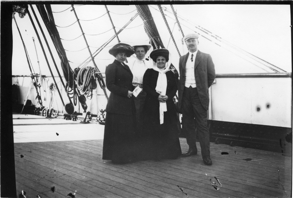 'Diverse fotografier från bl.a. dåvarande Nordrhodesia, nu Zambia, tagna av Konsul Magnus Leijer. :: :: Tre kvinnor och en man stående på däck på en båt. Fotograferade från nära avstånd.'