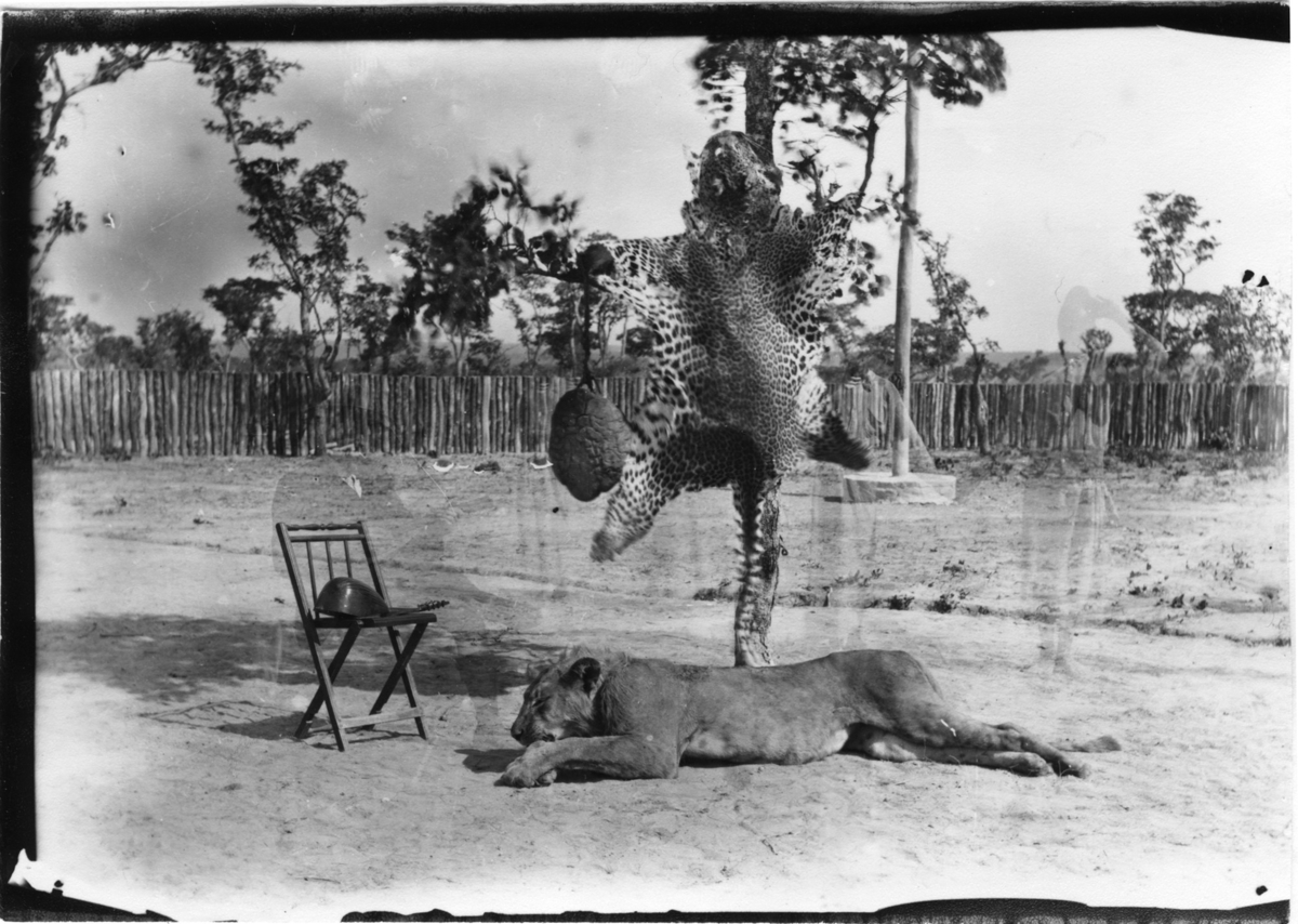 'Diverse fotografier från bl.a. dåvarande Nordrhodesia, nu Zambia, tagna av Konsul Magnus Leijer. :: :: Ett fällt lejon liggande nedanför ett träd där ett leopardskinn är uppspänt och ett sköldpaddskal(?) hänger. Bredvid står en stol med en mandolin (?) på.'