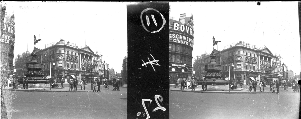 'Bildtext: ''Piccadilly circus.'' :: I förgrunden staty ev. fontän, vy med människor och hus. Vid fontänen sitter 1 kvinna med korg. Hattar, cykel, käpp. :: :: Ingår i serie med fotonr. 5263:1-16. Se även hela serien med fotonr. 5237-5267.'