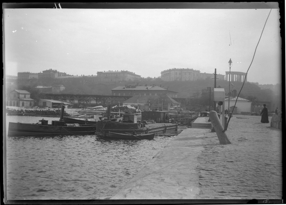 'Vy över hamn med båtar vid kaj. Människor. Byggnader, hus på högre parti på avstånd. Timmerhög. Ev. bro. :: :: Ingår i serie med fotonr. 5278:1-21. Se även fotonr. 5269-5292 med bilder från Stuxbergs resa till Kaukasien.'