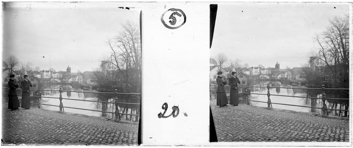 'Bildtext: ''Nyköpingsån, söderut från bron.'' (eller norrut från bron) :: 2 kvinnor stående på ev. bro, tittar ut över ån och hus och byggnader. Kullersten. Räcke. :: :: (Bildtexterna till Fotonr. 5256:4 och 5256:5: osäkert vilken som hör till vilket motiv.) :: Ingår i serie med fotonr. 5256:1-18, se även hela serien med fotonr. 5237-5267.'