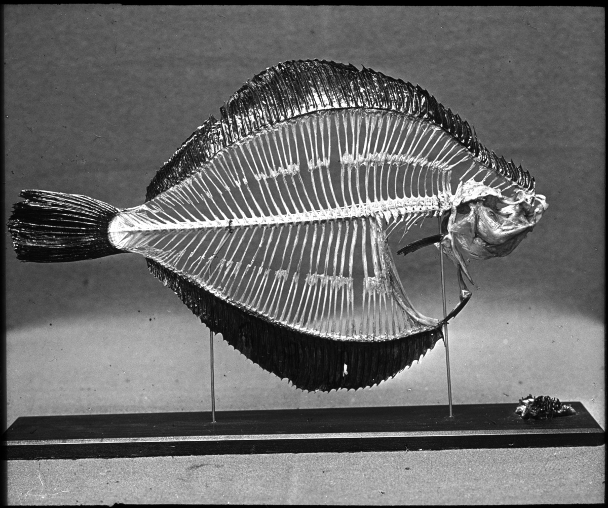 'Monterat skelett av Rhombus maximus, sett från sidan. :: :: Från Dr. Schlüter & Mass, Halle a S naturvetens. Läromedel. Numrerad I.C. Nr. 11. :: :: Ingår i serie med fotonr. 5374:1-30. Se även hela fotoserien 5374-5376.'