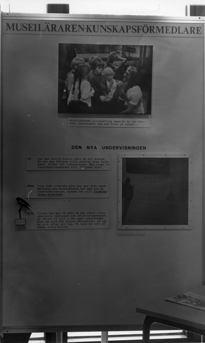 'Foto på Jubileumsutställningen, Göteborgs Naturhistoriska museum 150 år. :: :: Utställningsskärm angående undervisning på museet ''Museiläraren-Kunskapsförmedlare'' med monterad bofink (lektorsavd.), fotografi samt tv-apparat.'