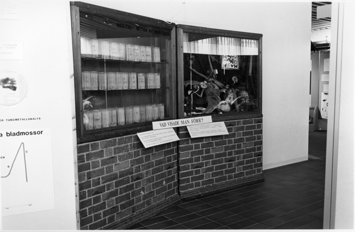 'Foto på Jubileumsutställningen, Göteborgs Naturhistoriska museum 150 år. :: :: Vy över utställningsmonter ''vad visade man förr? 1800-tal - mitten av 1900-talet'', spindelsaml, Arachn, litengasell 7569 + ormskin, Gems 30-5207, Apskelett Coll.au. 1898, liten apa Coll.au. 42, Sågfisk 2x Gen.kat 79-15.229 + Coll.au. 10.250, svinskalle privat, människoskalle privat, en del fågelägg, snäckor, fjärilar, rådjursfot, skorpion, hov, delar av sköldpaddskal m.m.'