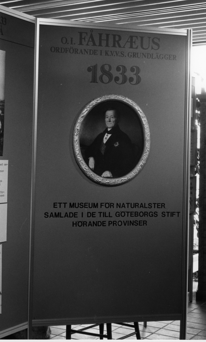 'Foto på Jubileumsutställningen, Göteborgs Naturhistoriska museum 150 år. :: :: Skärm med bild på ordf. i Kungliga vetenskaps- och vitterhetssamhället, o.i. Fåhræus, som 1833 grundlägger ''ett museum för naturalister samlade i de till Göteborgs stift hörande provinser.'''