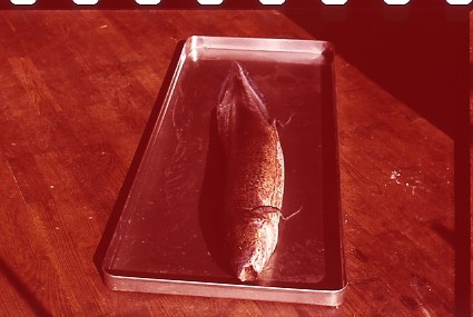 'Bilder en död lungfisk från akvariet. Avgjuten och placerad i basutställningen på Göteborgs Naturhistoriska museum, 1960. Avgjutningen gjord av Björn Wennerberg. :: :: Fotograferad på en bricka på ett bord. Ryggsidan synlig.'