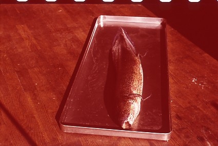 Titel: 'Bilder en död lungfisk från akvariet. Avgjuten och placerad i basutställningen på Göteborgs Naturhistoriska museum, 1960. Avgjutningen gjord av Björn Wennerberg. :: :: Fotograferad på en bricka på ett bord. Ryggsidan synlig.'