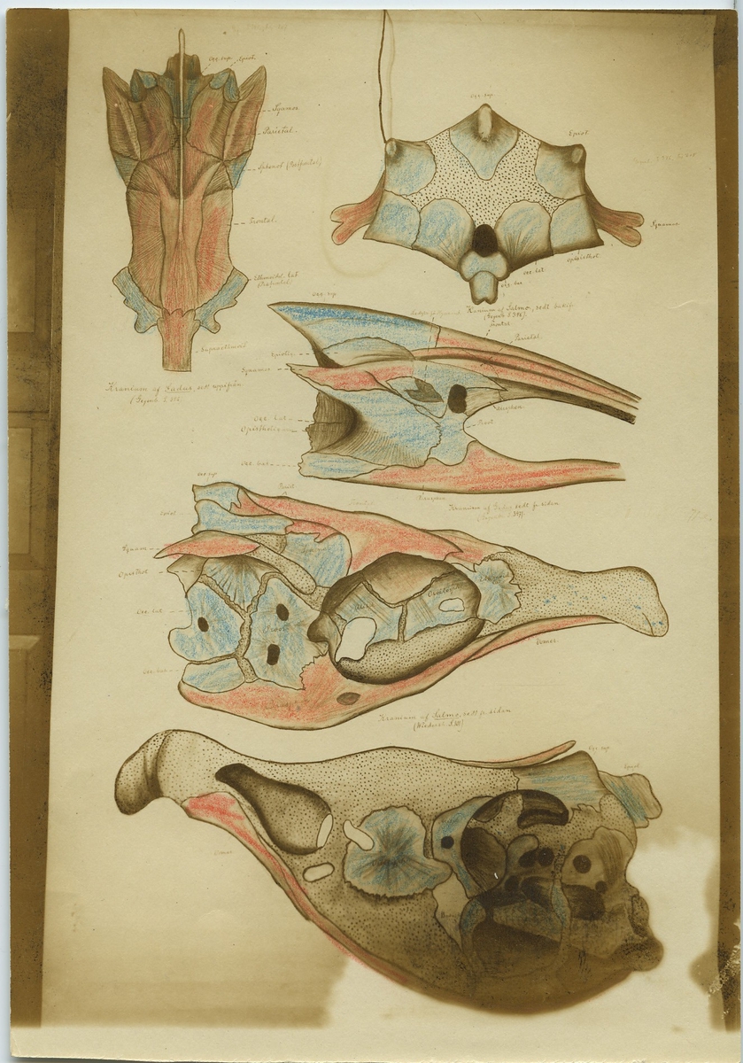 'Teckning av kranium hos Gadus (torsk?) ovanifrån samt kranium hos Salmo (lax?) sett bakifrån och från sidan. Latinska namn utsatta på delarna. Exemplaret färglagt. :: :: ''Fotografier använda vid dissektionskursen våren 1928'' . :: Avfotograferade teckningar på skelett och organ. :: På baksidan av vissa står det Kerstin Nyblén :: V.T.-18 :: , ur bok'