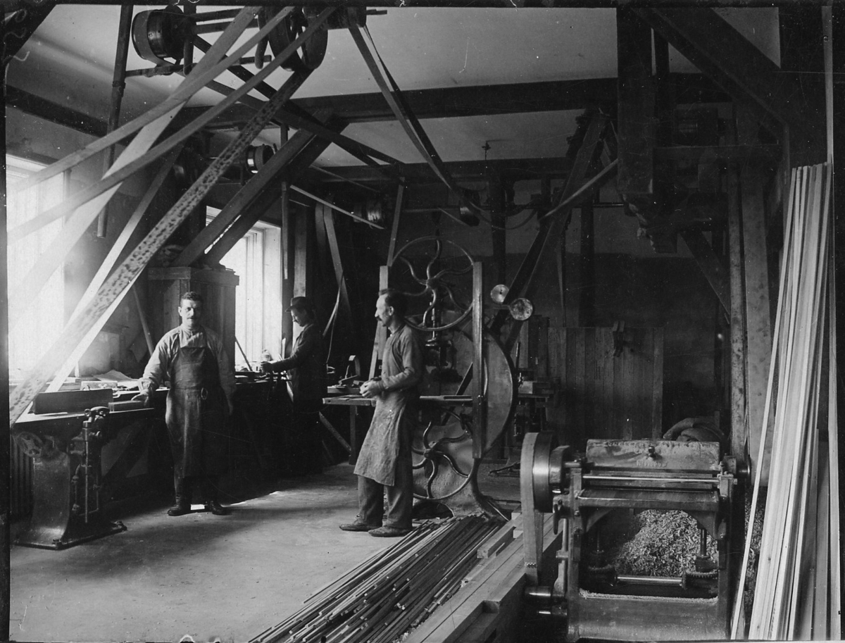 'Inflyttningen i Göteborgs Naturhistoriska Museibyggnad. :: :: Tre manliga arbetare på det som idag (2006) är entomologavdelningen. På fotografiet är rummet fullt av stora maskiner.'