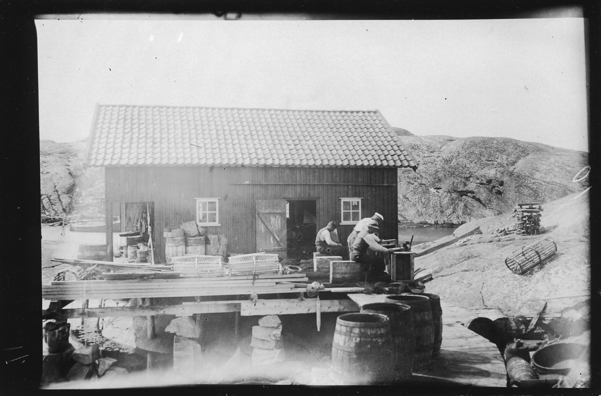 'Lotsarna syr ihop stora makrillvaden, hummertinor, trave till dessa, trätunnor vari vaden barkats. 3-4 män arbetar på brygga utanför träbyggand. Bryggan står på stenpelare. :: :: Ingår i serie med fotonr. 665-672.'