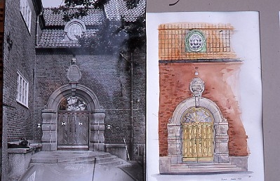 'Foton, teckningar och modeller av studenter från Chalmers Tekniska högskola, Institutionen för Arkitekturhistoria, Göteborg. Foton och teckningar av detaljer från Naturhistoriska museets byggader, byggnadsvård. :: Gamla entrén. :: :: Ingår i serie med fotonr. 6929:1-21.oto och teckning av'