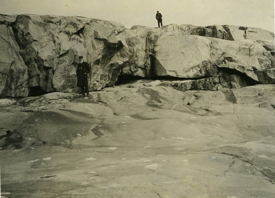 'Göteborgs Biologiska förenings utfärd till Väderöarna: :: :: Häckplats för lunnefågel vid Stora Knappen. 2 män med på bilden, kala berghällar. Männen iklädda kikare och huvudbonad, hatt. :: :: Ingår i serie med fotonr. 660-664.'