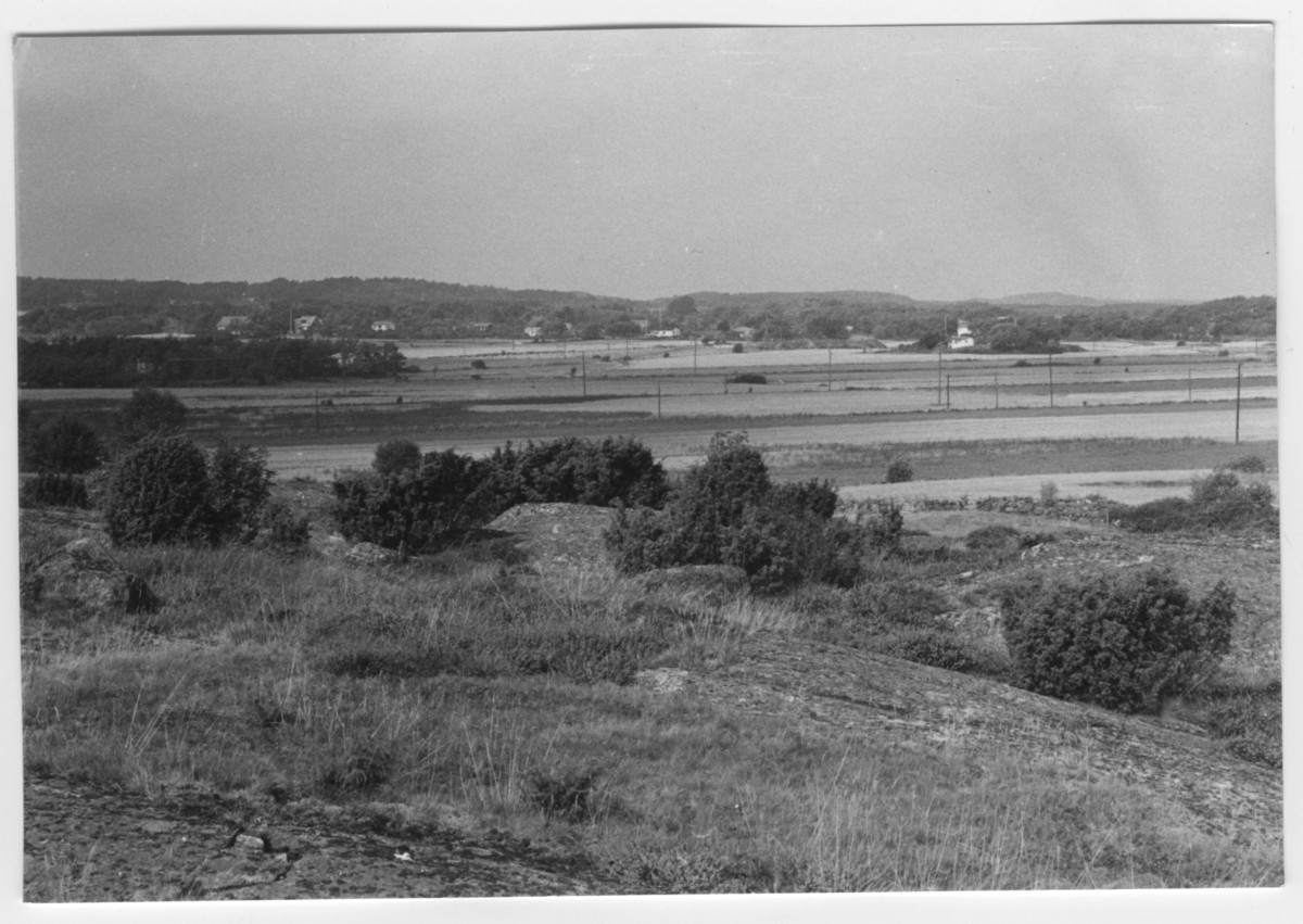 'Bildtext: ''Sedimentyta. Riktning 306.'' :: I förgrunden berghäll med enbuskar, vy ner över sedimentytan med öppna fält, åkrar och på avstånd hus. Stenmur. Stengärdesgård. :: :: Ingår i serie med fotonr. 6970:1-1125, dokumentation av Hisingens naturgeografi, visande landskapsformerna i stora drag och gjord inför exploateringen av området. Platserna för fotograferingen finns utsatta på karta i skala 1:4000 som finns på Göteborgs Naturhistoriska musem. Fotoriktningen mättes med kompass i gammalgrader.'