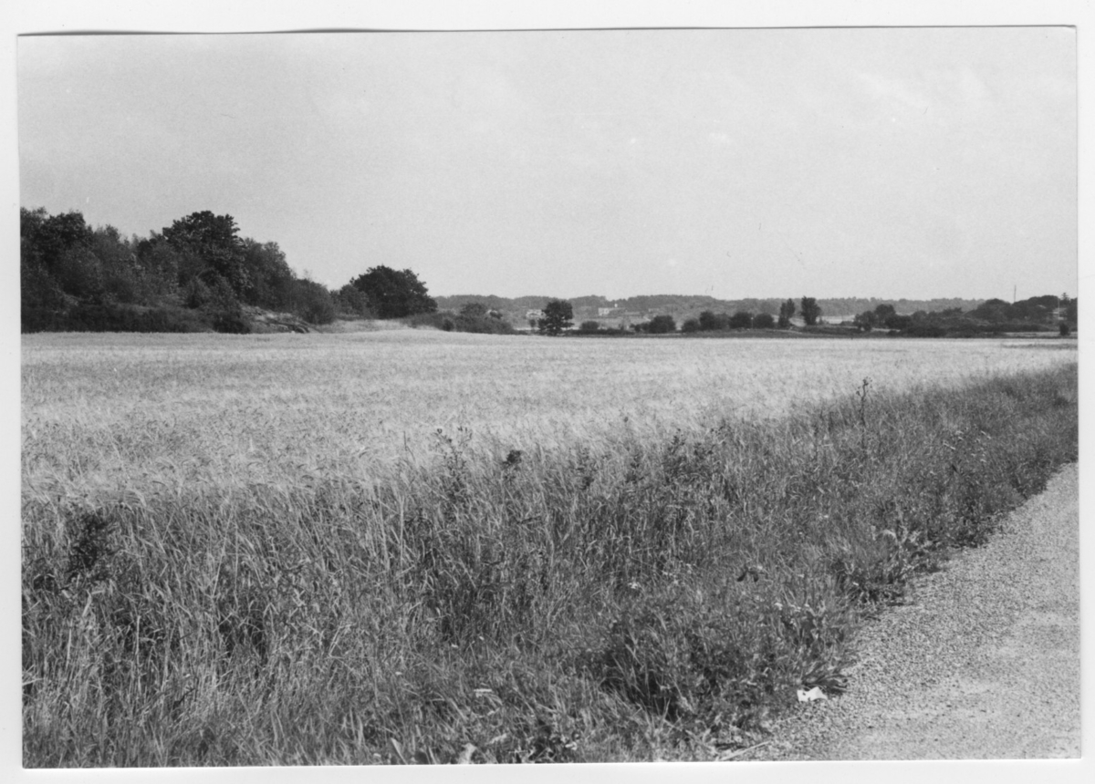 'Bildtext: ''Sedimentyta. Riktning 100.'' :: Vy med öppna fält, åkrar och trädvegetaion på avstånd. :: :: Ingår i serie med fotonr. 6970:1-1125, dokumentation av Hisingens naturgeografi, visande landskapsformerna i stora drag och gjord inför exploateringen av området. Platserna för fotograferingen finns utsatta på karta i skala 1:4000 som finns på Göteborgs Naturhistoriska musem. Fotoriktningen mättes med kompass i gammalgrader.'