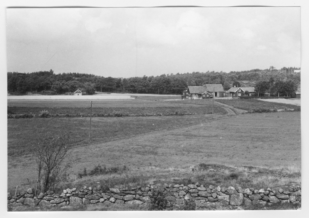 'Bildtext: ''Sedimentdalgång. Riktning 346.'' :: Vy med öppna fält, åkrar och stenmur och på avstånd gårdsbyggnader. Stengärdesgård. :: :: Ingår i serie med fotonr. 6970:1-1125, dokumentation av Hisingens naturgeografi, visande landskapsformerna i stora drag och gjord inför exploateringen av området. Platserna för fotograferingen finns utsatta på karta i skala 1:4000 som finns på Göteborgs Naturhistoriska musem. Fotoriktningen mättes med kompass i gammalgrader.'