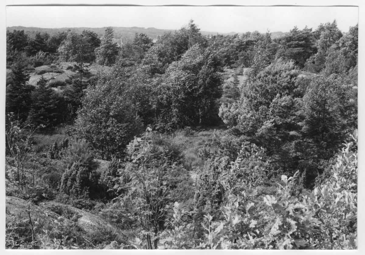 'Bildtext: ''Kärr. Riktning 298.'' :: Vy över berghällar bevuxna med träd och buskar, enbuskar, furu och lövträd. I det lägre partiet syns partiet med kärret. :: :: Ingår i serie med fotonr. 6970:1-1125, dokumentation av Hisingens naturgeografi, visande landskapsformerna i stora drag och gjord inför exploateringen av området. Platserna för fotograferingen finns utsatta på karta i skala 1:4000 som finns på Göteborgs Naturhistoriska musem. Fotoriktningen mättes med kompass i gammalgrader.'