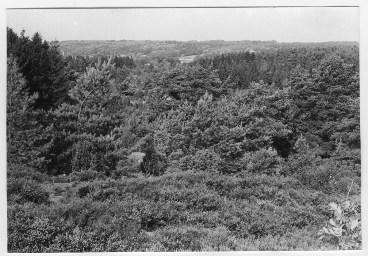 'Bildtext: ''Skogbevuxen sänka i hällandskap. Riktning 0.'' :: Vy över berghäll bevuxen med främst ljung, furu och gran. :: :: Ingår i serie med fotonr. 6970:1-1125, dokumentation av Hisingens naturgeografi, visande landskapsformerna i stora drag och gjord inför exploateringen av området. Platserna för fotograferingen finns utsatta på karta i skala 1:4000 som finns på Göteborgs Naturhistoriska musem. Fotoriktningen mättes med kompass i gammalgrader.'