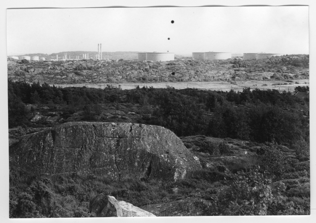 'Bildtext: ''Hällandskap med inträngande sedimentdalgång. Riktning 132.'' :: Vy med dalgången med öppna fält, åkermark mellan berghällar. I fonden silos, oljeraffinaderier. :: :: Ingår i serie med fotonr. 6970:1-1125, dokumentation av Hisingens naturgeografi, visande landskapsformerna i stora drag och gjord inför exploateringen av området. Platserna för fotograferingen finns utsatta på karta i skala 1:4000 som finns på Göteborgs Naturhistoriska musem. Fotoriktningen mättes med kompass i gammalgrader.'