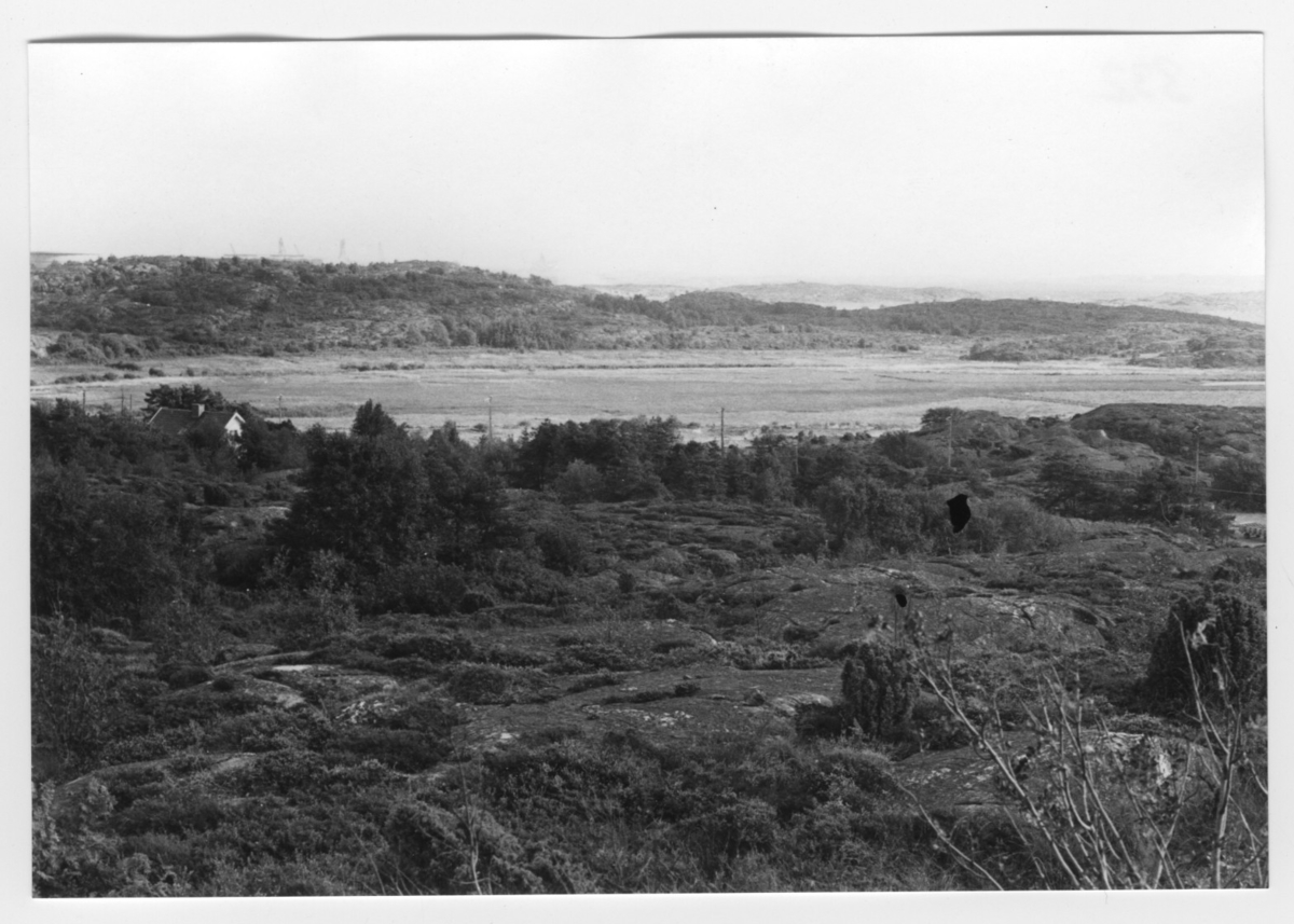 'Bildtext: ''Hällandskap med inträngande sedimentdalgång. Riktning 162.'' :: Vy över bergällar med buskvegetation och ett hus liggande ner mot dalgångens öppna fält, åkermark. :: :: Ingår i serie med fotonr. 6970:1-1125, dokumentation av Hisingens naturgeografi, visande landskapsformerna i stora drag och gjord inför exploateringen av området. Platserna för fotograferingen finns utsatta på karta i skala 1:4000 som finns på Göteborgs Naturhistoriska musem. Fotoriktningen mättes med kompass i gammalgrader.'