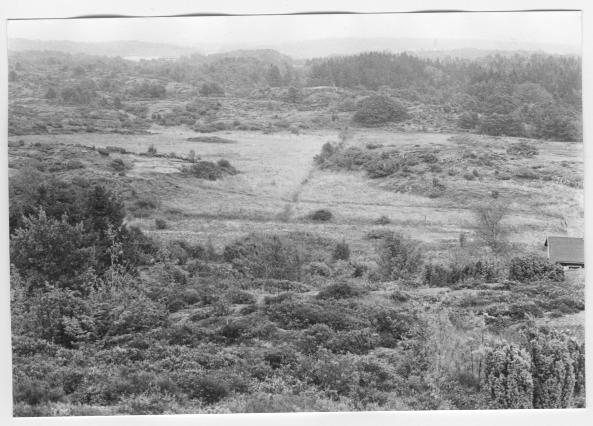 'Bildtext: ''Övre delen av sedimentdal. Riktning 86.'' :: Vy över del av sedimentdalgången med öppna fält och omkringliggande berghällar med enbuskar. Hustak synligt. :: :: Ingår i serie med fotonr. 6970:1-1125, dokumentation av Hisingens naturgeografi, visande landskapsformerna i stora drag och gjord inför exploateringen av området. Platserna för fotograferingen finns utsatta på karta i skala 1:4000 som finns på Göteborgs Naturhistoriska musem. Fotoriktningen mättes med kompass i gammalgrader.'