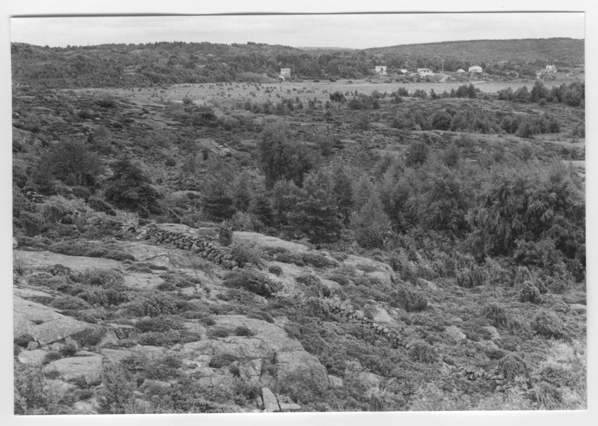 'Bildtext: ''Hällandskap. Riktning 142.'' Vy över berghäll med enbuskvegetation med stenmur. Vy med öppet fält på avstånd nedanför hus. I fonden busk- och trädklädda berghällar. Stengärdesgård. :: :: Ingår i serie med fotonr. 6970:1-1125, dokumentation av Hisingens naturgeografi, visande landskapsformerna i stora drag och gjord inför exploateringen av området. Platserna för fotograferingen finns utsatta på karta i skala 1:4000 som finns på Göteborgs Naturhistoriska musem. Fotoriktningen mättes med kompass i gammalgrader.'