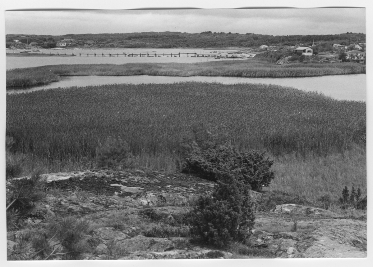 'Bildtext: ''Vik med vassvegetation. Riktning 28.'' I förgrunden berghäll med enbuskar. Vy ut över viken med vassvegetation. På avstånd små hus och enklare träbro över vattnet. Småbåtar liggande längs träbron/bryggan. :: :: Ingår i serie med fotonr. 6970:1-1125, dokumentation av Hisingens naturgeografi, visande landskapsformerna i stora drag och gjord inför exploateringen av området. Platserna för fotograferingen finns utsatta på karta i skala 1:4000 som finns på Göteborgs Naturhistoriska musem. Fotoriktningen mättes med kompass i gammalgrader.'