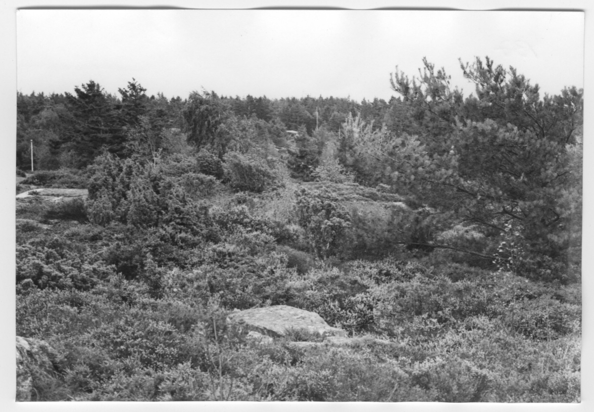 'Bildtext: ''Skogsområde. Riktning 148.'' Närbild på berghäll med enbuskar och ljungvegetation samt tall och björk. Hus, stuga samt flaggstång skymtar fram. :: :: Ingår i serie med fotonr. 6970:1-1125, dokumentation av Hisingens naturgeografi, visande landskapsformerna i stora drag och gjord inför exploateringen av området. Platserna för fotograferingen finns utsatta på karta i skala 1:4000 som finns på Göteborgs Naturhistoriska musem. Fotoriktningen mättes med kompass i gammalgrader.'