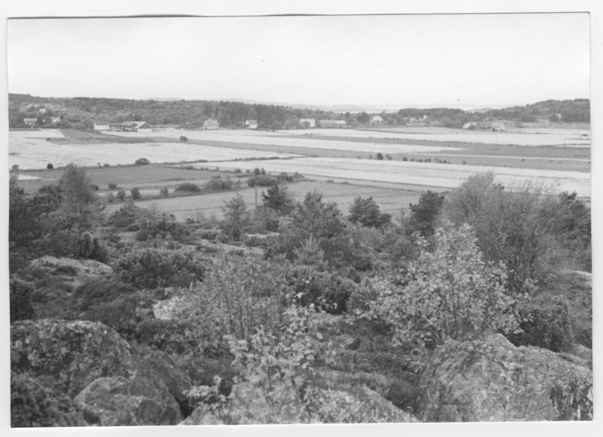 'Bildtext: ''Sedimentyta. Riktning 248.'' I förgrunden berghäll med enbuskar och lövträd. Vy ner över öppna fält, åkrar, avgränsade av ev. stenmurar med enstaka träd och buskar. På avstånd hus och gårde nedanför bergsluttning med trädvegetation. Stengärdesgård. :: :: Ingår i serie med fotonr. 6970:1-1125, dokumentation av Hisingens naturgeografi, visande landskapsformerna i stora drag och gjord inför exploateringen av området. Platserna för fotograferingen finns utsatta på karta i skala 1:4000 som finns på Göteborgs Naturhistoriska musem. Fotoriktningen mättes med kompass i gammalgrader.'