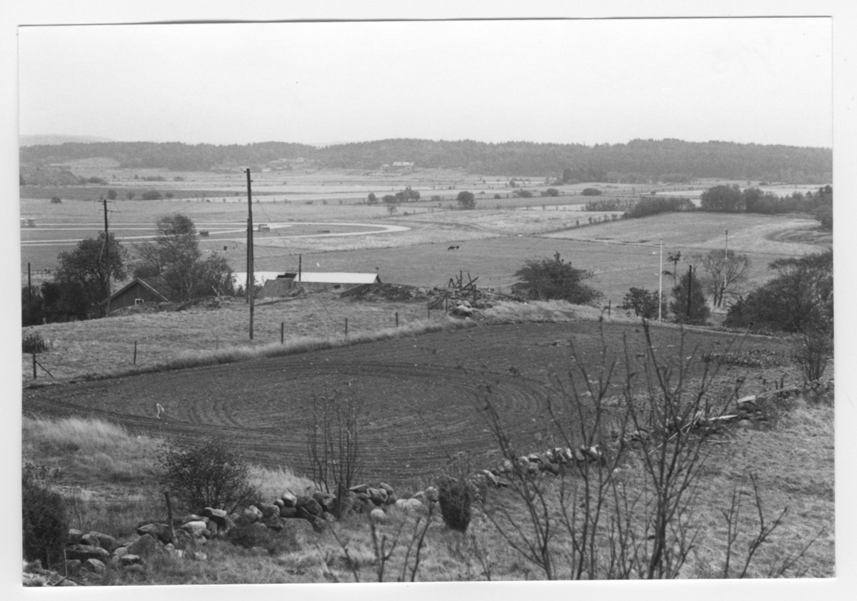'Bildtext: ''Sedimentyta. Riktning 88.'' I förgrunden stenmur, öppna fält, åker, gräsmark med staket. Vy med hus, gård, flaggstång nedanför berghällspartiet. Vy ut över öppna fält, åkrar med enstaka träd och buskar. I fonden hus och skog. Stengärdesgård. :: :: Ingår i serie med fotonr. 6970:1-1125, dokumentation av Hisingens naturgeografi, visande landskapsformerna i stora drag och gjord inför exploateringen av området. Platserna för fotograferingen finns utsatta på karta i skala 1:4000 som finns på Göteborgs Naturhistoriska musem. Fotoriktningen mättes med kompass i gammalgrader.'
