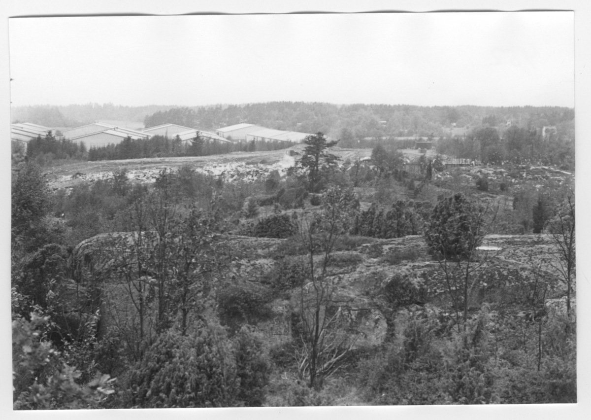'Bildtext: ''Hällandskap. Riktning 324.'' I förgrunden berghäll med enbuskar. Vy ner över ett antal större ekonomibyggnader och på avstånd hus. :: :: Ingår i serie med fotonr. 6970:1-1125, dokumentation av Hisingens naturgeografi, visande landskapsformerna i stora drag och gjord inför exploateringen av området. Platserna för fotograferingen finns utsatta på karta i skala 1:4000 som finns på Göteborgs Naturhistoriska musem. Fotoriktningen mättes med kompass i gammalgrader.'
