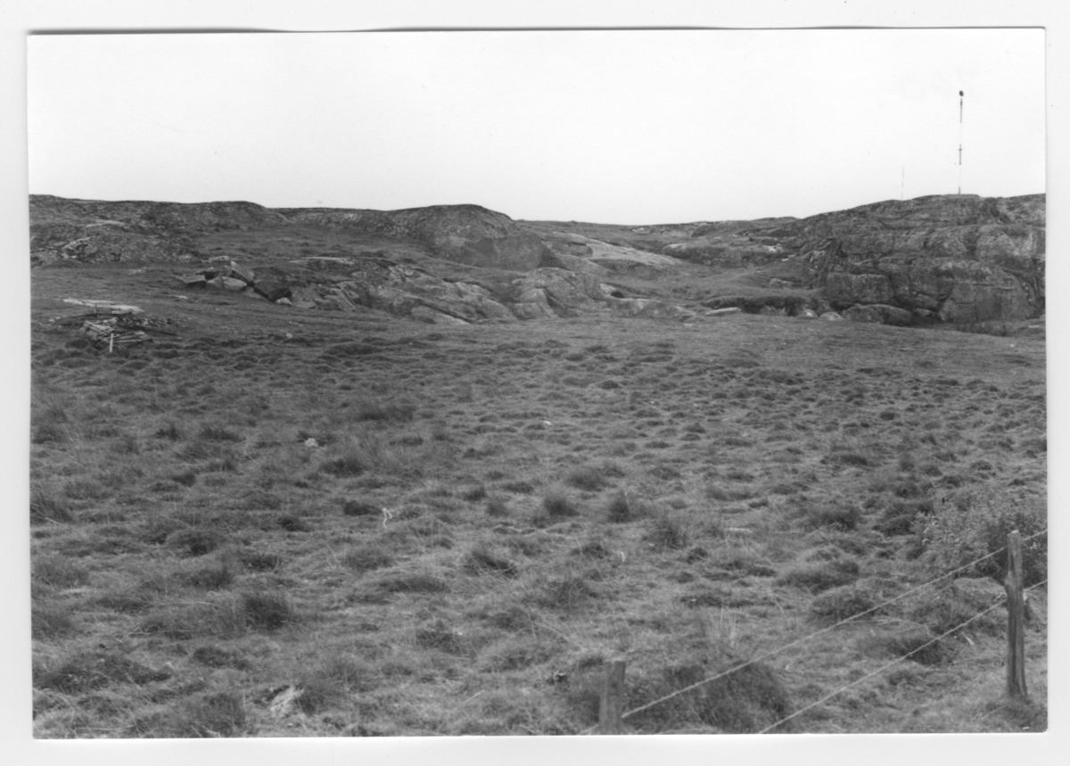 'Bildtext: ''Äng i hällparti. Riktning 170.'' Vy över äng, ev. betesmark med staket, och kal berghäll. :: :: Ingår i serie med fotonr. 6970:1-1125, dokumentation av Hisingens naturgeografi, visande landskapsformerna i stora drag och gjord inför exploateringen av området. Platserna för fotograferingen finns utsatta på karta i skala 1:4000 som finns på Göteborgs Naturhistoriska musem. Fotoriktningen mättes med kompass i gammalgrader.'