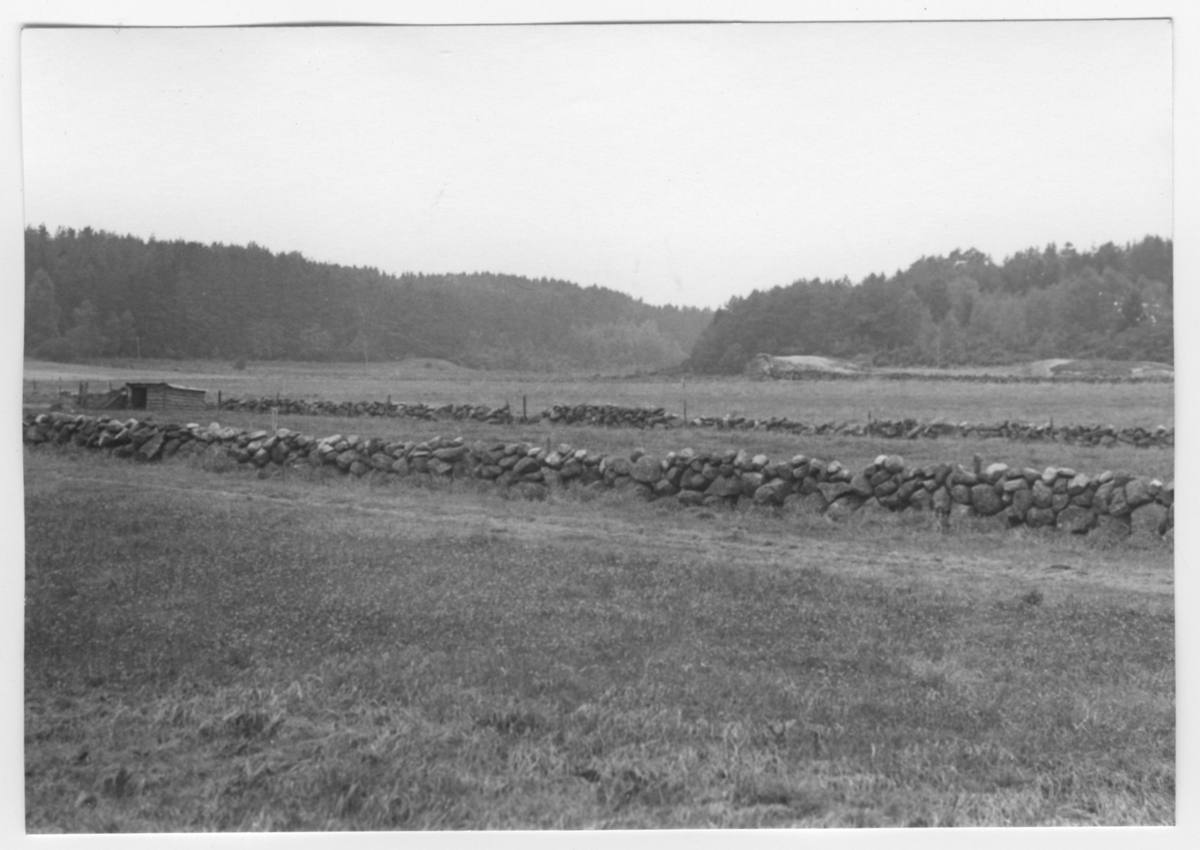 'Bildtext: ''Sedimentdalgång. Riktning 270.'' Vy över gräsmark med stenmurar. Liten trähydda ev. för djur. Stengärdesgård. :: :: Ingår i serie med fotonr. 6970:1-1125, dokumentation av Hisingens naturgeografi, visande landskapsformerna i stora drag och gjord inför exploateringen av området. Platserna för fotograferingen finns utsatta på karta i skala 1:4000 som finns på Göteborgs Naturhistoriska musem. Fotoriktningen mättes med kompass i gammalgrader.'