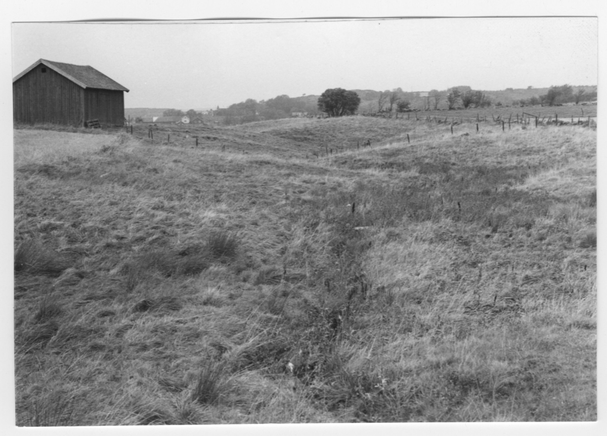 'Bildtext: ''Meandrande bäck. Riktning 18.'' Vy över gräsmark, betesmark, med meandrande vattendrag och staket. Lada till vänster. På avstånd gårdsbyggnader, hus. :: :: Ingår i serie med fotonr. 6970:1-1125, dokumentation av Hisingens naturgeografi, visande landskapsformerna i stora drag och gjord inför exploateringen av området. Platserna för fotograferingen finns utsatta på karta i skala 1:4000 som finns på Göteborgs Naturhistoriska musem. Fotoriktningen mättes med kompass i gammalgrader.'