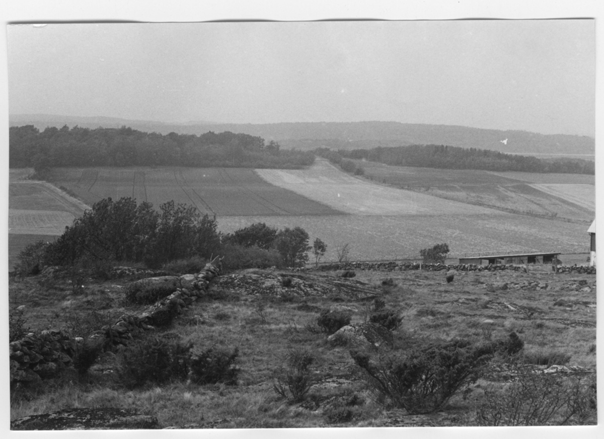 'Bildtext: ''Sedimentdalgång. Riktning 286.'' I förgrunden berghäll med stenmur, enbuskar och gräsmark. Talldunge. Vy ner mot öppna fält, åkrar och på avstånd skog. Stengärdesgård. :: :: Ingår i serie med fotonr. 6970:1-1125, dokumentation av Hisingens naturgeografi, visande landskapsformerna i stora drag och gjord inför exploateringen av området. Platserna för fotograferingen finns utsatta på karta i skala 1:4000 som finns på Göteborgs Naturhistoriska musem. Fotoriktningen mättes med kompass i gammalgrader.'