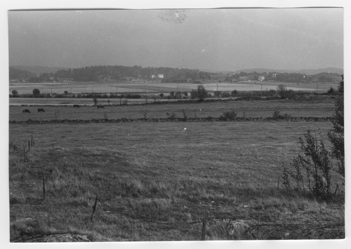 'Bildtext: ''Sedimentyta. Riktning 90.'' Vy ut över öppna gräsmarker med stenmurar med enstaka träd och staket. Med betande nötboskap. Elledning. I fonden hus och gårdsbyggnader. Stengärdesgård. :: :: Ingår i serie med fotonr. 6970:1-1125, dokumentation av Hisingens naturgeografi, visande landskapsformerna i stora drag och gjord inför exploateringen av området. Platserna för fotograferingen finns utsatta på karta i skala 1:4000 som finns på Göteborgs Naturhistoriska musem. Fotoriktningen mättes med kompass i gammalgrader.'