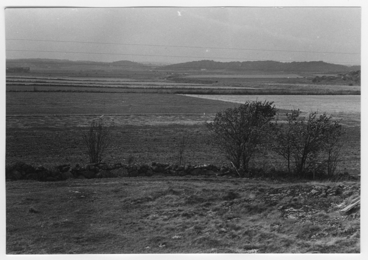 'Bildtext: ''Sedimentdalgång. Riktning 308.'' I förgrunden berghäll, nedanför stenmur. Vy ut över öppna fält, åkrar. På avstånd hus, gård. Stengärdesgård. :: :: Ingår i serie med fotonr. 6970:1-1125, dokumentation av Hisingens naturgeografi, visande landskapsformerna i stora drag och gjord inför exploateringen av området. Platserna för fotograferingen finns utsatta på karta i skala 1:4000 som finns på Göteborgs Naturhistoriska musem. Fotoriktningen mättes med kompass i gammalgrader.'
