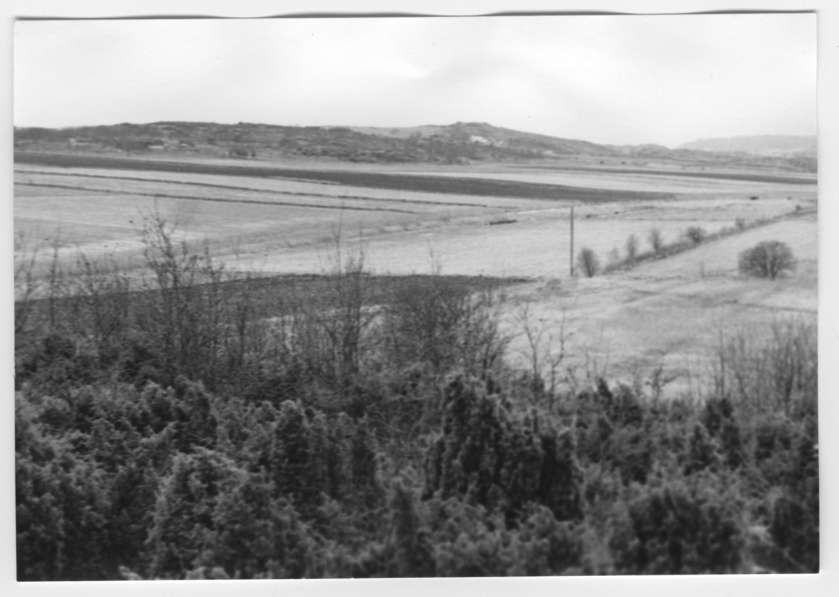 'Bildtext: ''Sedimentyta. Riktning 242.'' I förgrunden berghäll med enbuskar och lövträd. Vy ner över öppna fält, åkrar med enstaka träd. :: :: Ingår i serie med fotonr. 6970:1-1125, dokumentation av Hisingens naturgeografi, visande landskapsformerna i stora drag och gjord inför exploateringen av området. Platserna för fotograferingen finns utsatta på karta i skala 1:4000 som finns på Göteborgs Naturhistoriska musem. Fotoriktningen mättes med kompass i gammalgrader.'
