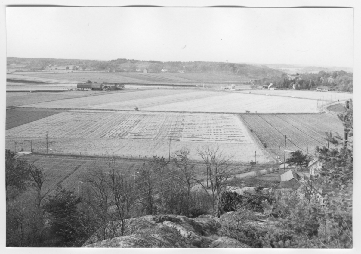 'Bildtext: ''Kvillens dalgång. Riktning 226.'' Vy fotograferad uppifrån höjd ner över dalgången. Nedanför höjden hus. Vy ut över öppna fält, åkrar och gårdar, hus. :: :: Ingår i serie med fotonr. 6970:1-1125, dokumentation av Hisingens naturgeografi, visande landskapsformerna i stora drag och gjord inför exploateringen av området. Platserna för fotograferingen finns utsatta på karta i skala 1:4000 som finns på Göteborgs Naturhistoriska musem. Fotoriktningen mättes med kompass i gammalgrader.'