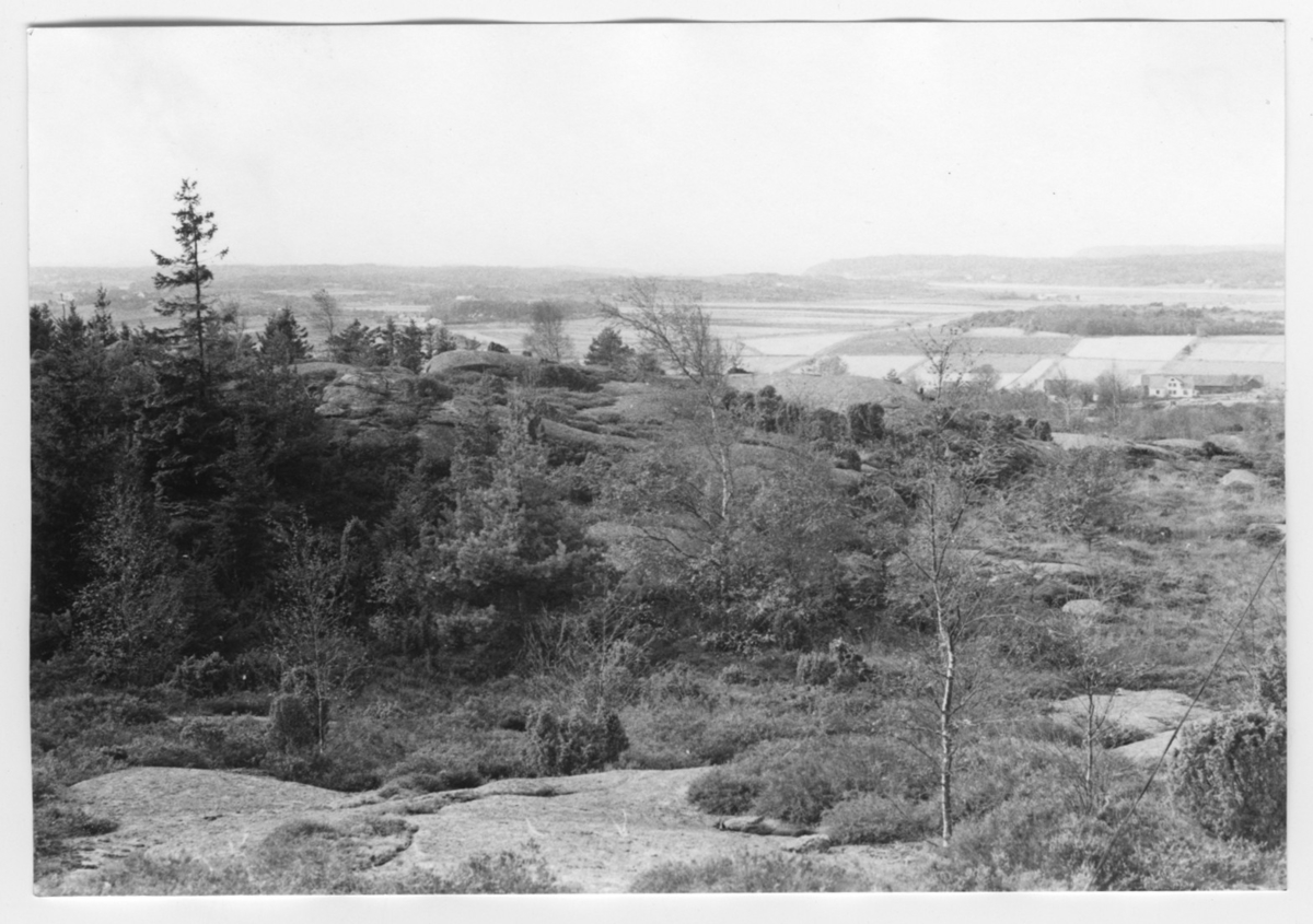'Bildtext: ''Bergsparti. Riktniing 250.'' :: :: Ingår i serie med fotonr. 6970:1-1125, dokumentation av Hisingens naturgeografi, visande landskapsformerna i stora drag och gjord inför exploateringen av området. Platserna för fotograferingen finns utsatta på karta i skala 1:4000 som finns på Göteborgs Naturhistoriska musem. Fotoriktningen mättes med kompass i gammalgrader.'