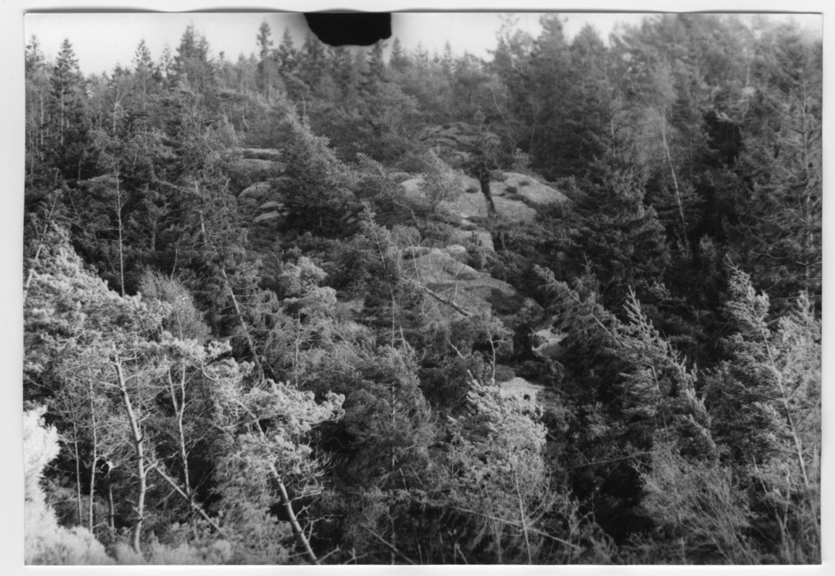 'Bildtext: ''Skogsparti. Riktning 110.'' :: :: Ingår i serie med fotonr. 6970:1-1125, dokumentation av Hisingens naturgeografi, visande landskapsformerna i stora drag och gjord inför exploateringen av området. Platserna för fotograferingen finns utsatta på karta i skala 1:4000 som finns på Göteborgs Naturhistoriska musem. Fotoriktningen mättes med kompass i gammalgrader.'