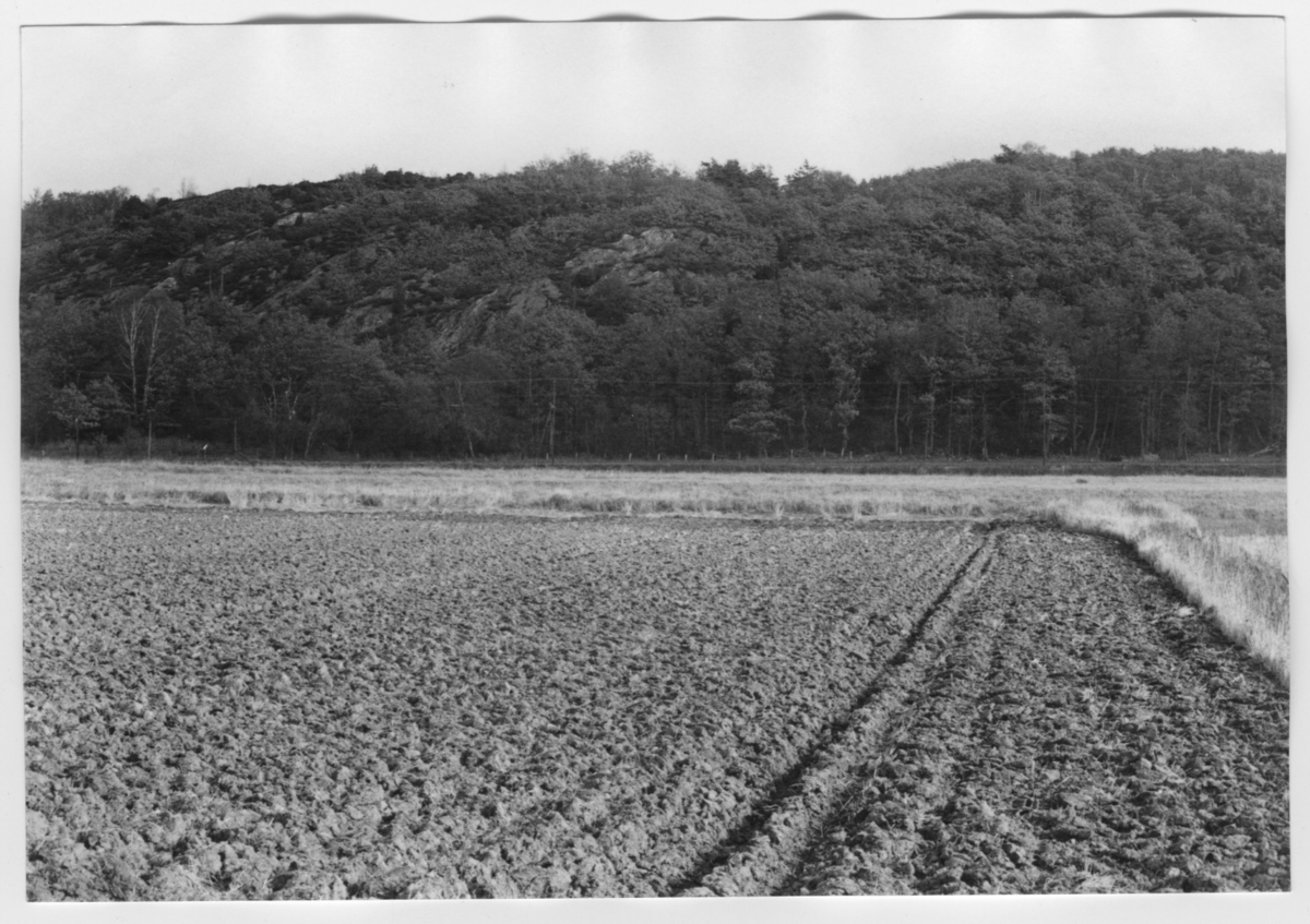 'Bildtext: ''Sedimentyta. Riktning 78.'' Vy över åkermarken med trädklätt berg i bakgrunden. :: :: Ingår i serie med fotonr. 6970:1-1125, dokumentation av Hisingens naturgeografi, visande landskapsformerna i stora drag och gjord inför exploateringen av området. Platserna för fotograferingen finns utsatta på karta i skala 1:4000 som finns på Göteborgs Naturhistoriska musem. Fotoriktningen mättes med kompass i gammalgrader.'