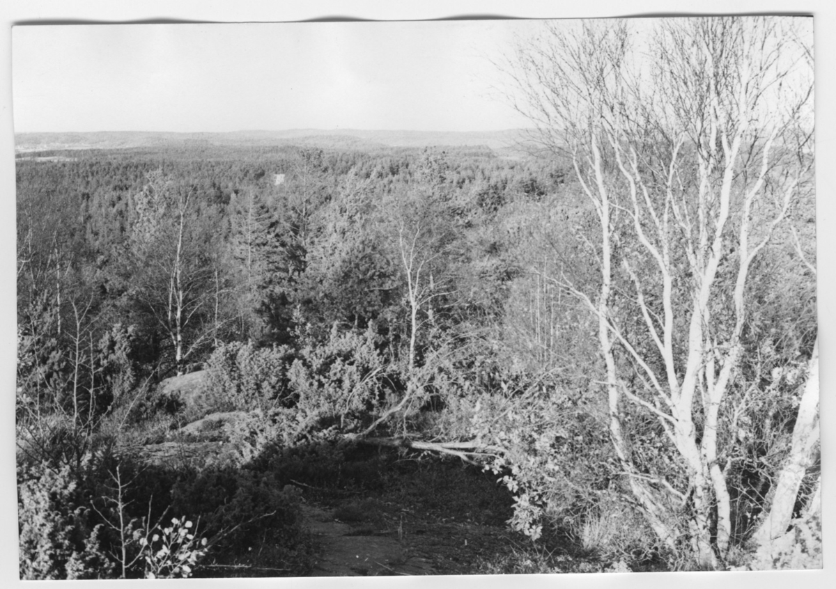 'Bildtext: ''Skogsområde. Riktning 30.'' :: :: Ingår i serie med fotonr. 6970:1-1125, dokumentation av Hisingens naturgeografi, visande landskapsformerna i stora drag och gjord inför exploateringen av området. Platserna för fotograferingen finns utsatta på karta i skala 1:4000 som finns på Göteborgs Naturhistoriska musem. Fotoriktningen mättes med kompass i gammalgrader.'