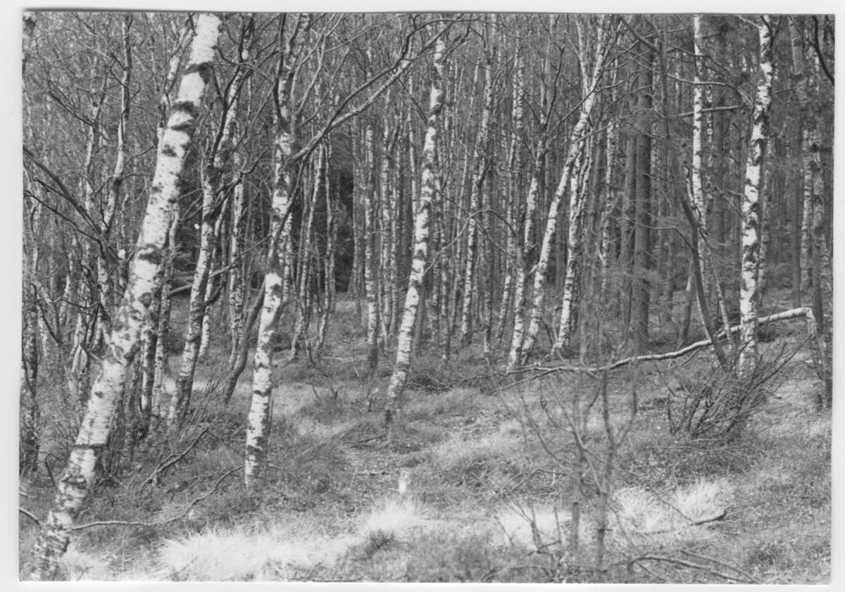 'Bildtext: ''Björkskog på sumpig mark. Riktning 11.'' :: :: Ingår i serie med fotonr. 6970:1-1125, dokumentation av Hisingens naturgeografi, visande landskapsformerna i stora drag och gjord inför exploateringen av området. Platserna för fotograferingen finns utsatta på karta i skala 1:4000 som finns på Göteborgs Naturhistoriska musem. Fotoriktningen mättes med kompass i gammalgrader.'