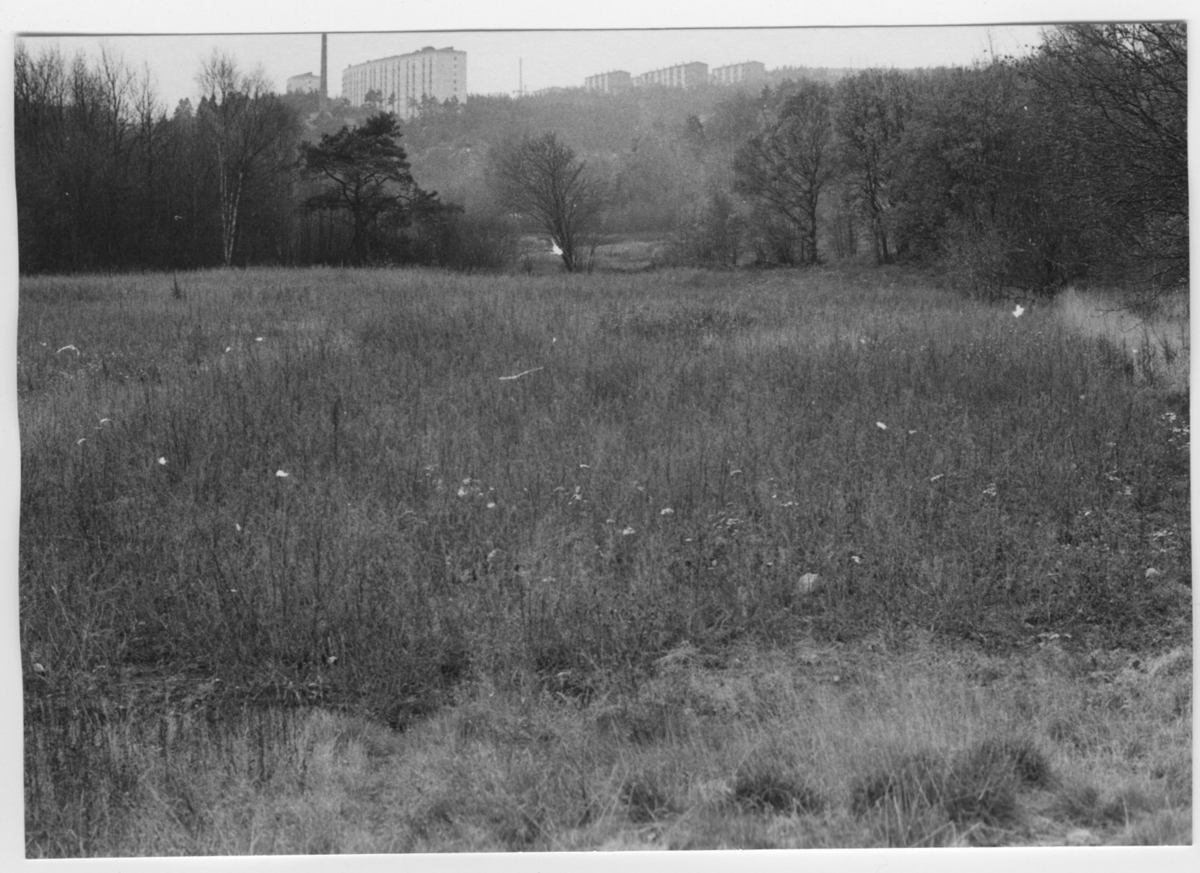 'Bildtext: ''Fossil åker. Riktning 210.'' :: :: Ingår i serie med fotonr. 6970:1-1125, dokumentation av Hisingens naturgeografi, visande landskapsformerna i stora drag och gjord inför exploateringen av området. Platserna för fotograferingen finns utsatta på karta i skala 1:4000 som finns på Göteborgs Naturhistoriska musem. Fotoriktningen mättes med kompass i gammalgrader.'