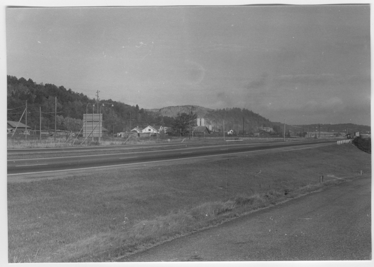 'Bildtext: ''Götaälvdalgången. Flodslätt. Riktning 320.'' Vy med väg i förgrunden och hus på andra sidan nedanför trädbevuxet berg. :: :: Ingår i serie med fotonr. 6970:1-1125, dokumentation av Hisingens naturgeografi, visande landskapsformerna i stora drag och gjord inför exploateringen av området. Platserna för fotograferingen finns utsatta på karta i skala 1:4000 som finns på Göteborgs Naturhistoriska musem. Fotoriktningen mättes med kompass i gammalgrader.'