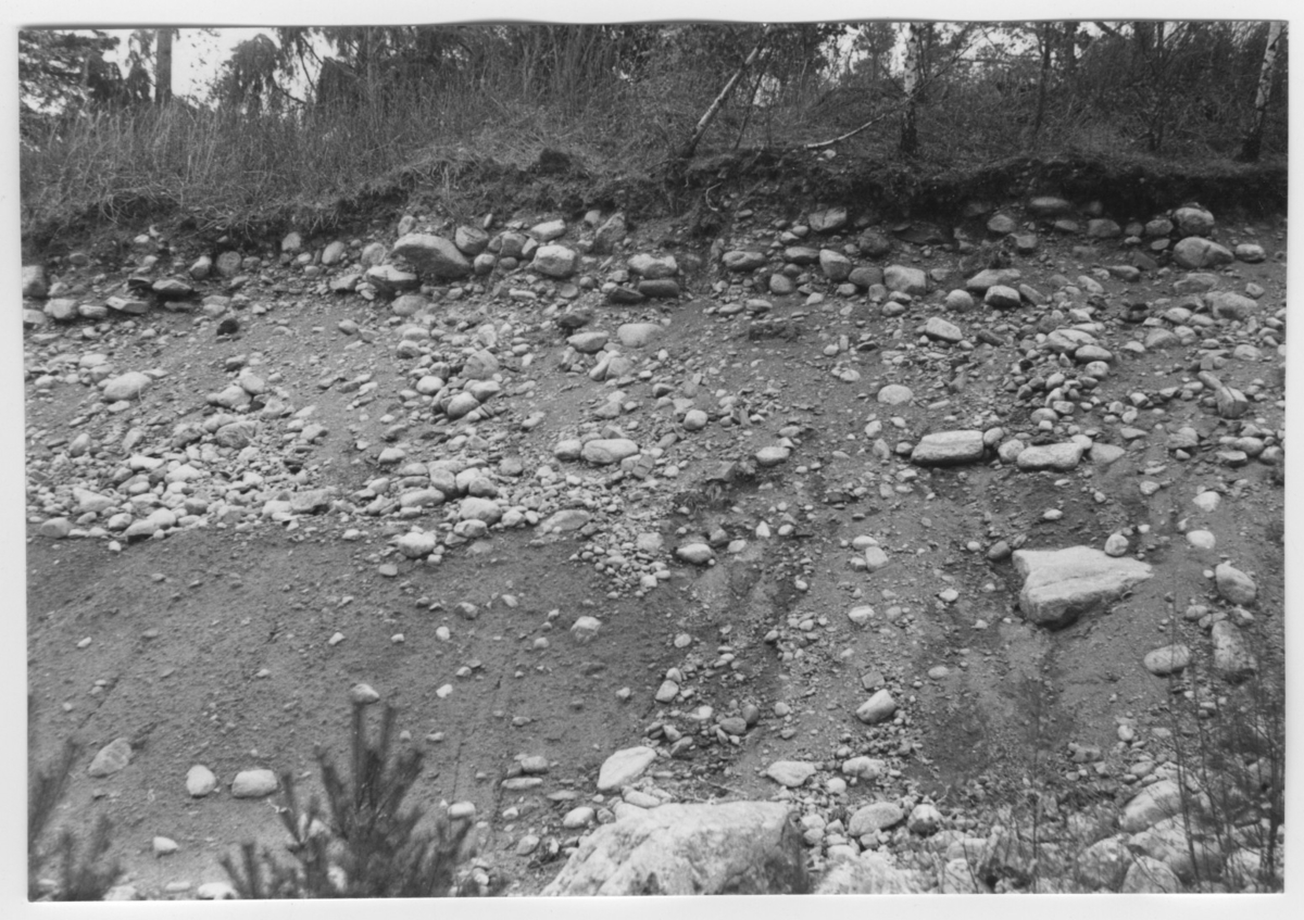 'Bildtext: ''Skärning i grustag. Riktning 350.'' :: :: Ingår i serie med fotonr. 6970:1-1125, dokumentation av Hisingens naturgeografi, visande landskapsformerna i stora drag och gjord inför exploateringen av området. Platserna för fotograferingen finns utsatta på karta i skala 1:4000 som finns på Göteborgs Naturhistoriska musem. Fotoriktningen mättes med kompass i gammalgrader.'