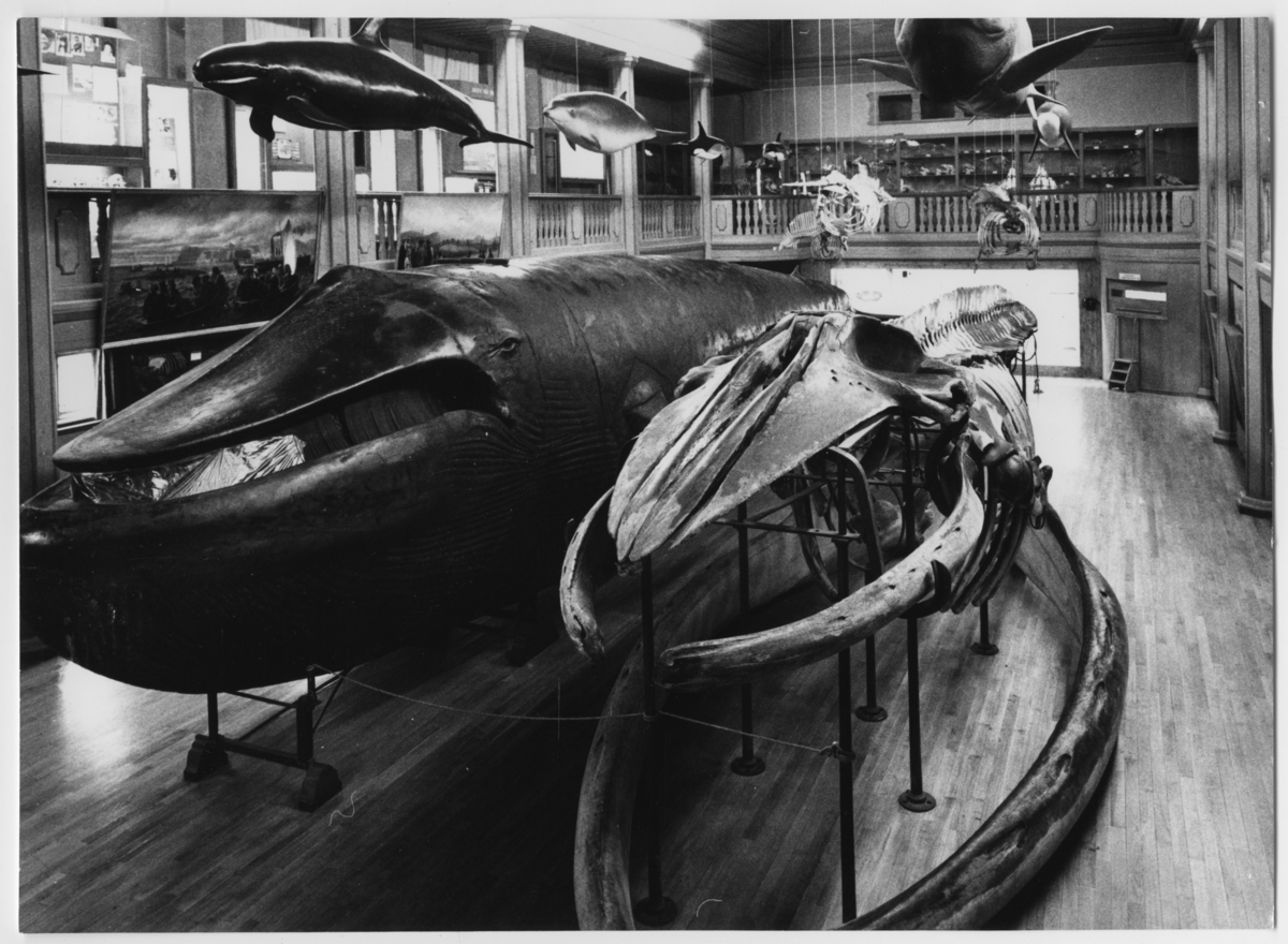'Bilder från Göteborgs Naturhistoriska museum tagna som övningsuppgift av fotografer på Göteborgs Stads yrkesskolor: :: :: Valsalen sedd från trappan mot Malmska valens främre del. Diverse andra valar, Halvspäckhuggare m.fl. modeller och skelett hängande ner från taket över Malmska valen. :: :: Ingår i serie med fotonr. 6953:1-53.'