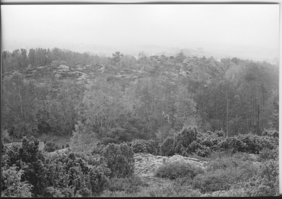 'Bildtext: ''Hällpartier. Riktning 200.'' :: :: Ingår i serie med fotonr. 6970:1-1125, dokumentation av Hisingens naturgeografi, visande landskapsformerna i stora drag och gjord inför exploateringen av området. Platserna för fotograferingen finns utsatta på karta i skala 1:4000 som finns på Göteborgs Naturhistoriska musem. Fotoriktningen mättes med kompass i gammalgrader.'