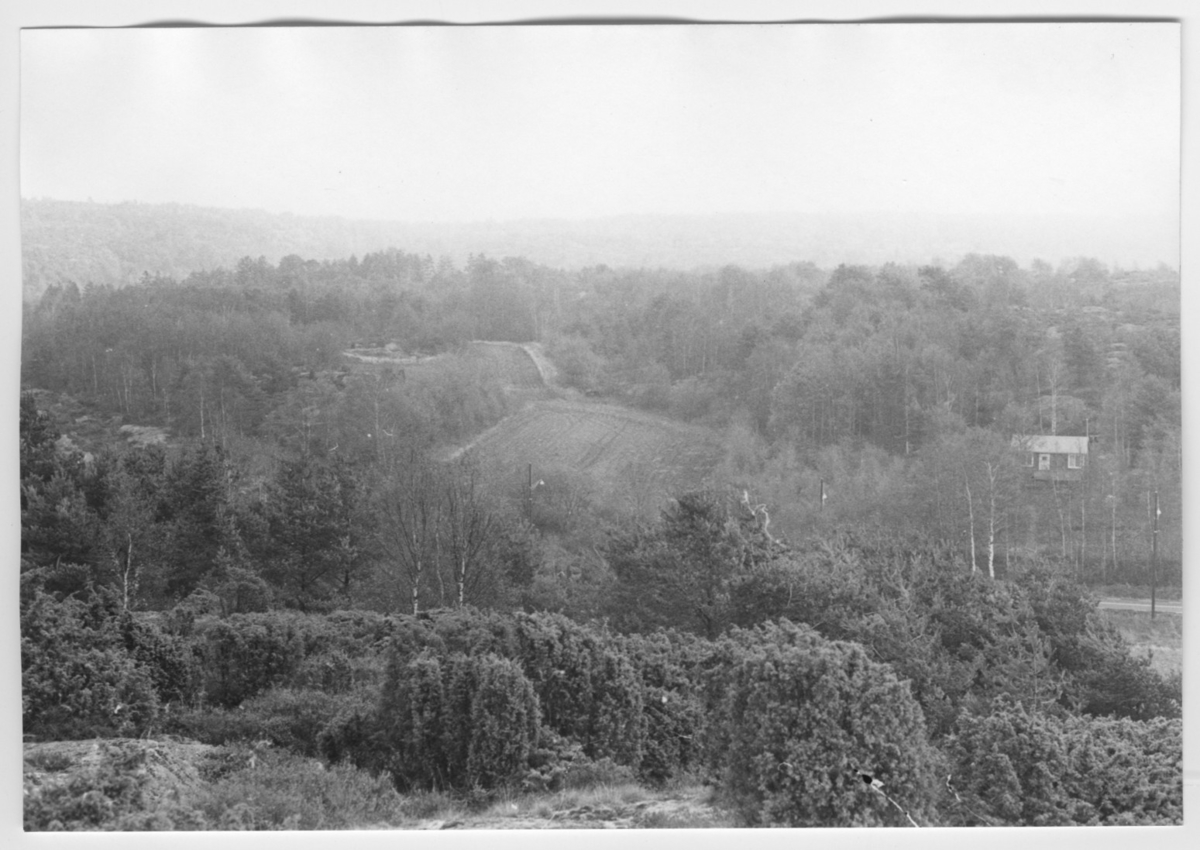 'Bildtext: ''Hällpartier. Riktning 84.'' :: :: Ingår i serie med fotonr. 6970:1-1125, dokumentation av Hisingens naturgeografi, visande landskapsformerna i stora drag och gjord inför exploateringen av området. Platserna för fotograferingen finns utsatta på karta i skala 1:4000 som finns på Göteborgs Naturhistoriska musem. Fotoriktningen mättes med kompass i gammalgrader.'