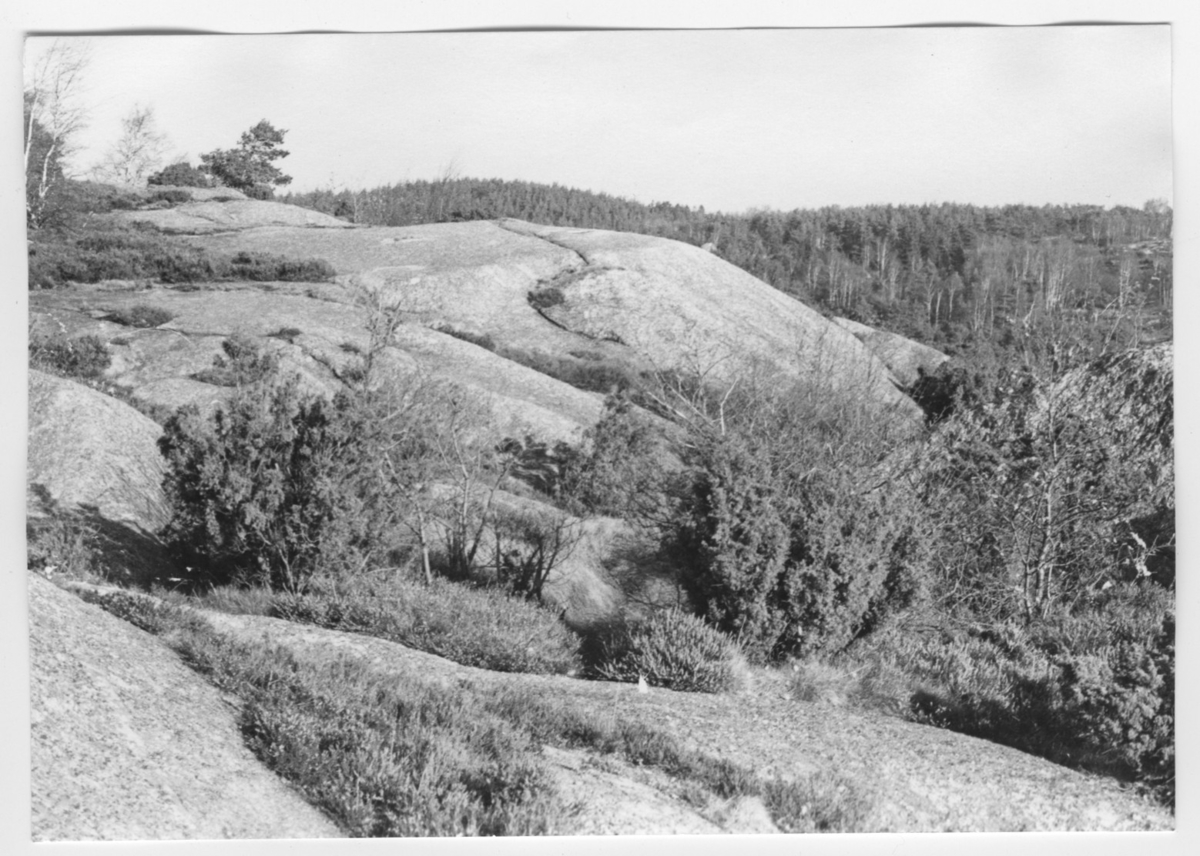 'Bildtext: ''Rundhällar. Riktning 52.'' :: :: Ingår i serie med fotonr. 6970:1-1125, dokumentation av Hisingens naturgeografi, visande landskapsformerna i stora drag och gjord inför exploateringen av området. Platserna för fotograferingen finns utsatta på karta i skala 1:4000 som finns på Göteborgs Naturhistoriska musem. Fotoriktningen mättes med kompass i gammalgrader.'